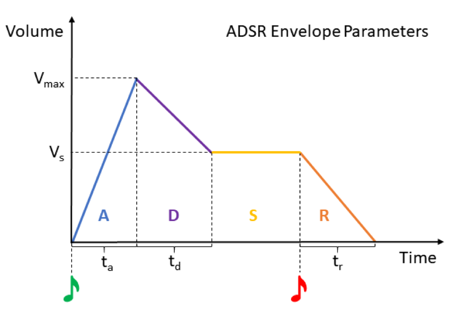Nábeh (attack) predstavuje čas, ktorý zvuku trvá, kým začne znieť, teda od úplného ticha hneď po stlačení klávesy alebo akéhokoľvek vstupu (napríklad tlačidlo na ovládači) až po stanovenú maximálnu hlasitosť. Útlm (decay) určuje čas toho, ako sa hlasitosť daného zvuku znižuje po nasledujúcu hodnotu trvania. Trvanie (sustain) je úroveň zvuku, ktorá ostáva nemenná počas trvajúceho držania klávesy alebo spustenia akéhokoľvek vstupu, až pokým klávesu nepustíme, resp. vstup neuvoľníme. Uvoľňovanie (release) predstavuje čas, ktorý zvuku trvá, kým od poslednej hodnoty neprejde do úplného ticha, resp. zastavenia.